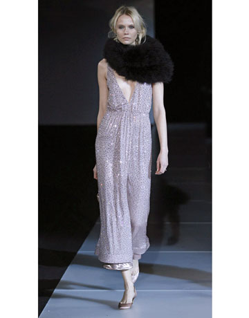 Armani is not a brand that usually tickles my fancy, but I loved the simple elegance and ease of this dress. It's gorgeous. I don't wear a lot of sparkles, ever, really, but the cut of the dress is so effortless. And the fur neck ring makes it that much more glamorous.